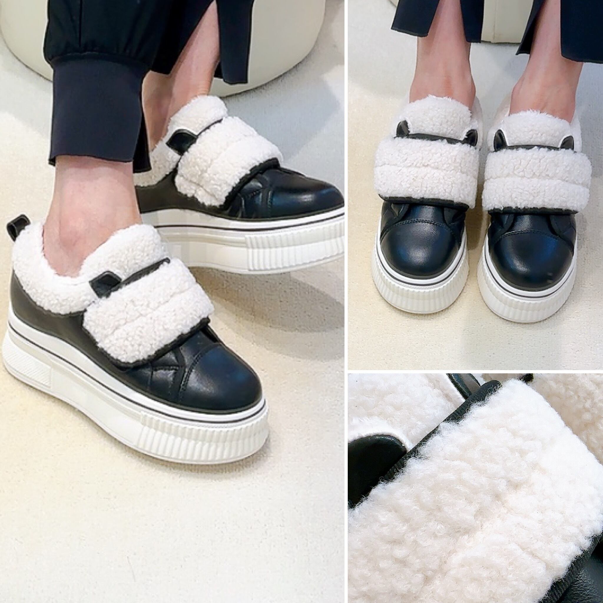 デュアルのスニーカー ボアスニーカーは、あったかく可愛い 足長効果 商品名:スニーカー このスニーカーは、ボア素材を使用し、ブラックカラーの展開です。柔らかいボアが心地よいフィット感を提供し、カジュアルながらも上品な印象を与えます。普段使いから軽いお出かけまで幅広く活躍します。 スニーカーで、毎日のコーディネートを楽しんで下さいね。